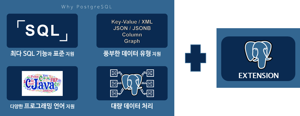 PostgreSQL은 Extension 이라는 요소를 통해 자유로운 기능 추가가 가능하다는 강력한 특징이 있다. Extension은 말 그대로 확장 기능으로, 익히 알고 있는 PostGIS, Citus 등도 기본 PostgreSQL에 특수한 목적을 가지고 기능을 추가시키는 extension에 속한다. 이러한 extension은 PostgreSQL의 가장 큰 특징이자 장점으로 꼽히며, 전 세계적으로 활발한 커뮤니티 활동을 바탕으로 다른 DB들이 따라올 수 없는 기술확장성을 보여준다. 최근에는 인공지능 연구를 위한 벡터기반의 데이터를 다루는 extension들도 활발하게 공개되고 있는 추세로 미래 환경에 적합한 DB로서 특징을 가지고 있다. (‘나무위키 PostgreSQL Extension 소개 글’ 중 일부)