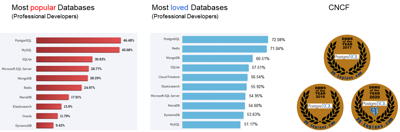또한 PostgreSQL은 전문 개발자의 46.48%가 가장 인기 있는 기술로, 72.08%는 가장 사랑받는 기술로 ‘PostgreSQL’을 선정하였으며, 클라우드 네이티브 컴퓨팅 재단(Cloud Native Computing Foundation, CNCF)은 기술 레이더(technology radar)에서 최고의 데이터베이스로 ‘PostgreSQL’을 선정할 만큼 글로벌 적으로 가장 트렌드 한 오픈소스 DB이다.