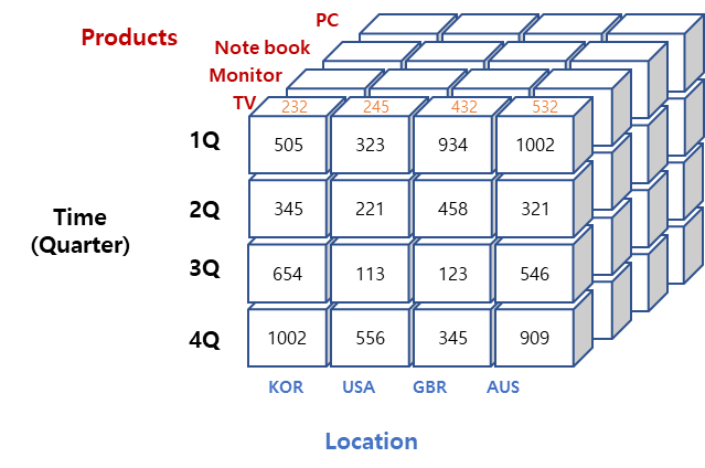 관계형 데이터베이스 테이블은 개별 데이터를 2차원 (행 X열)로 저장하는 구조입니다. 이 구조를 이용하는 경우 테이블에 저장된 다차원 데이터를 쿼리하고 분석할 수 있지만 데이터의 크기가 커지면 성능이 저하되고 다른 차원의 관점으로 결과를 보기 위해서는 결과를 재구성하는데 많은 작업이 필요합니다. 이때 데이터 큐브가 사용됩니다.