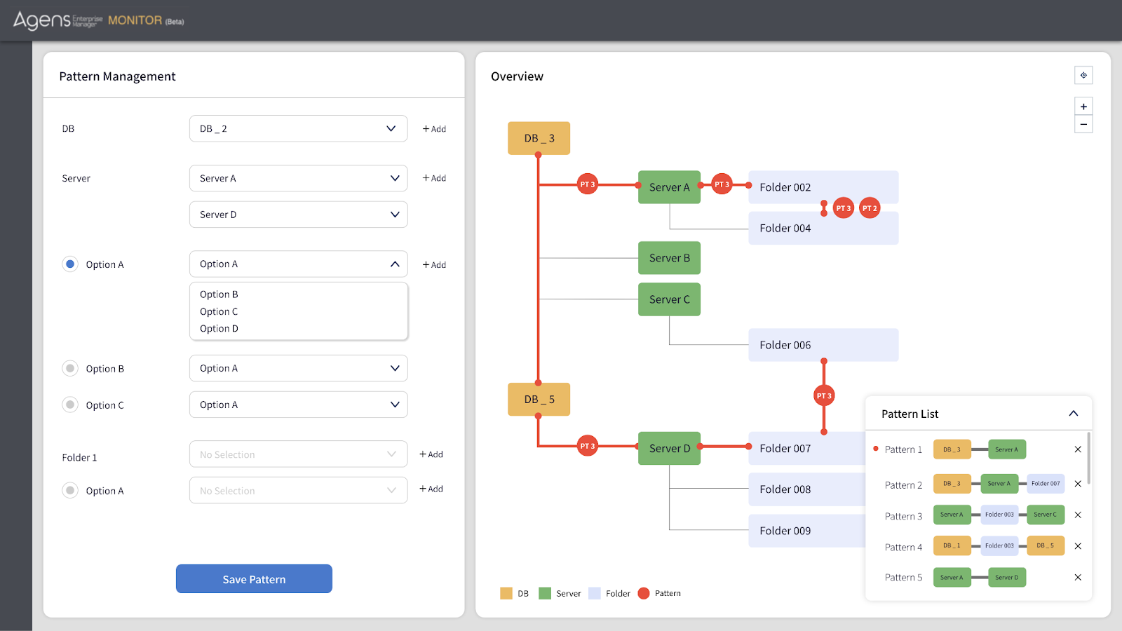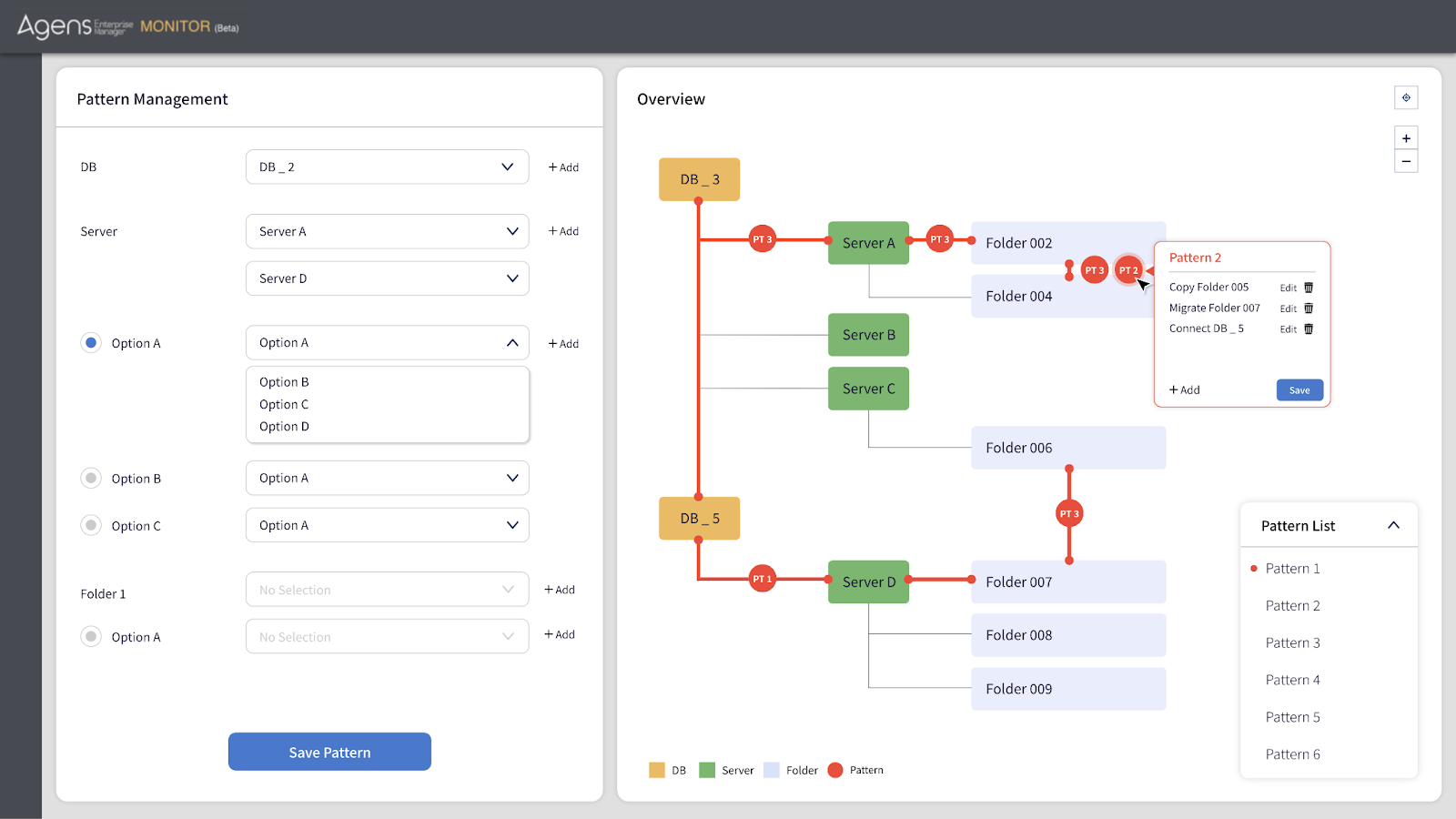 - 패턴 내역 페이지에서 저장된 패턴이 어느 DB 및 서버와 연결되어 있는지를 ‘Data Lineage’ 형태로 모든 관계를 한눈에 파악할 수 있습니다.
