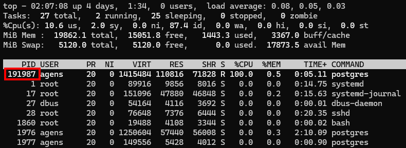 특히 DB 서버 프로세스의 PID 값을 확인하여 해당 프로세스의 리소스 사용량을 집중적으로 모니터링해야 합니다.