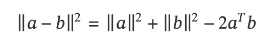 두 점인 a, b간의 벡터인 Norm의 정의와 벡터의 차의 정의에서 유클리드 거리는 다음과 같은 식을 구할 수 있습니다.