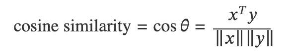 유클리드 거리와 마찬가지로 두 벡터 x,y간의 코사인 유사도를 수학식으로 표현해보면 다음과 같습니다.