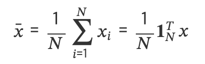 다음으로는 가중평균(weighted average)에 대해 알아보겠습니다. 벡터로 표현된 𝑁개의 데이터의 단순 평균은 아래와 같은 수식으로 나타낼 수 있습니다: