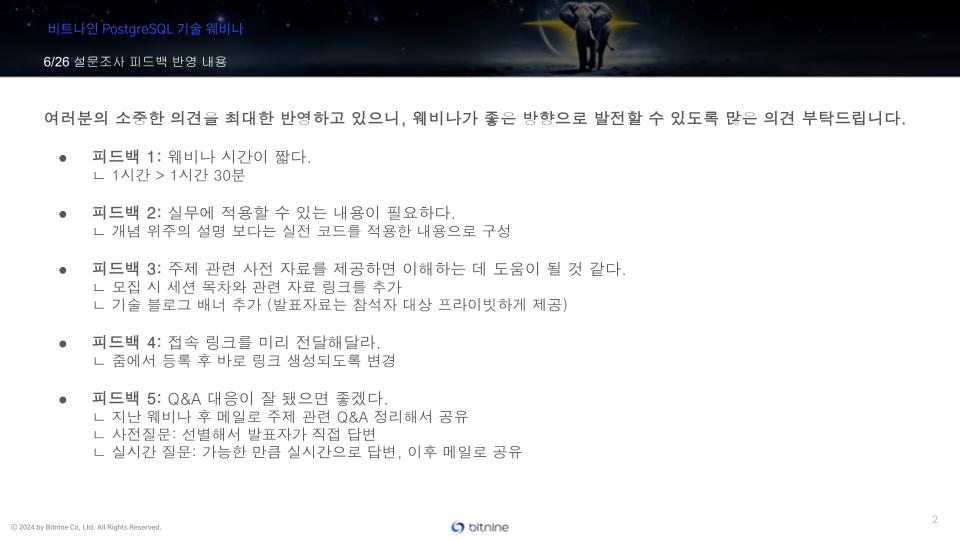 이번에는 웨비나를 시작하면서 지난 설문조사에서 받은 피드백 반영사항을 공유드렸습니다.